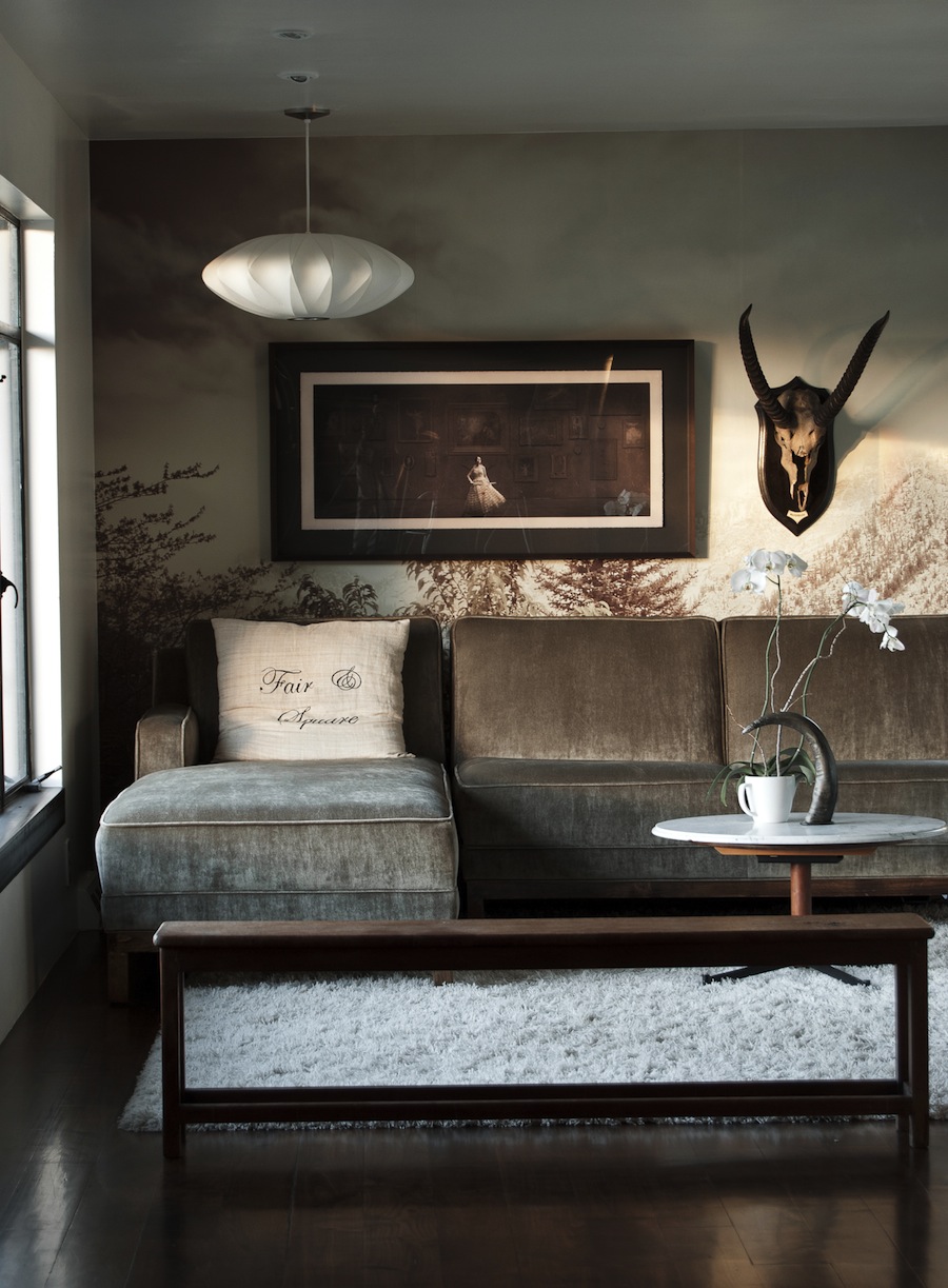 1) Straight from the Camera. No, really. What makes this wallpaper so very appealing is the fact that it's little more than an image from your very own camera. Cody Derrick's former home on Apollo Drive was just at the foot of Mount Olympus, but the main living space (facing northwest and all) didn't get to take advantage of those tasty mountain views. His answer? Snap a shot of said hulking mountain, drain a touch of color (to achieve a monochromatic look), and have it printed up for the space. Views. Voila.