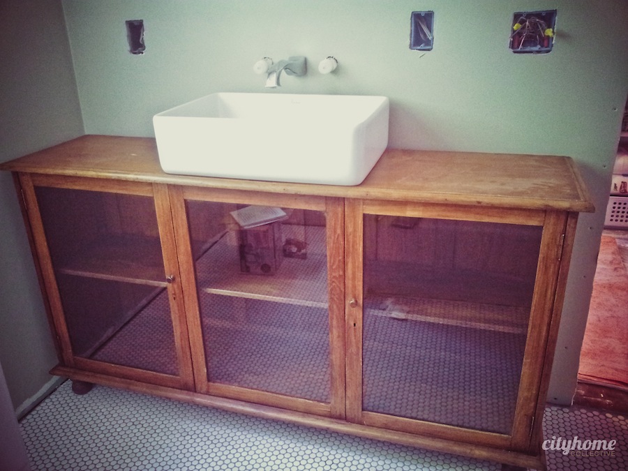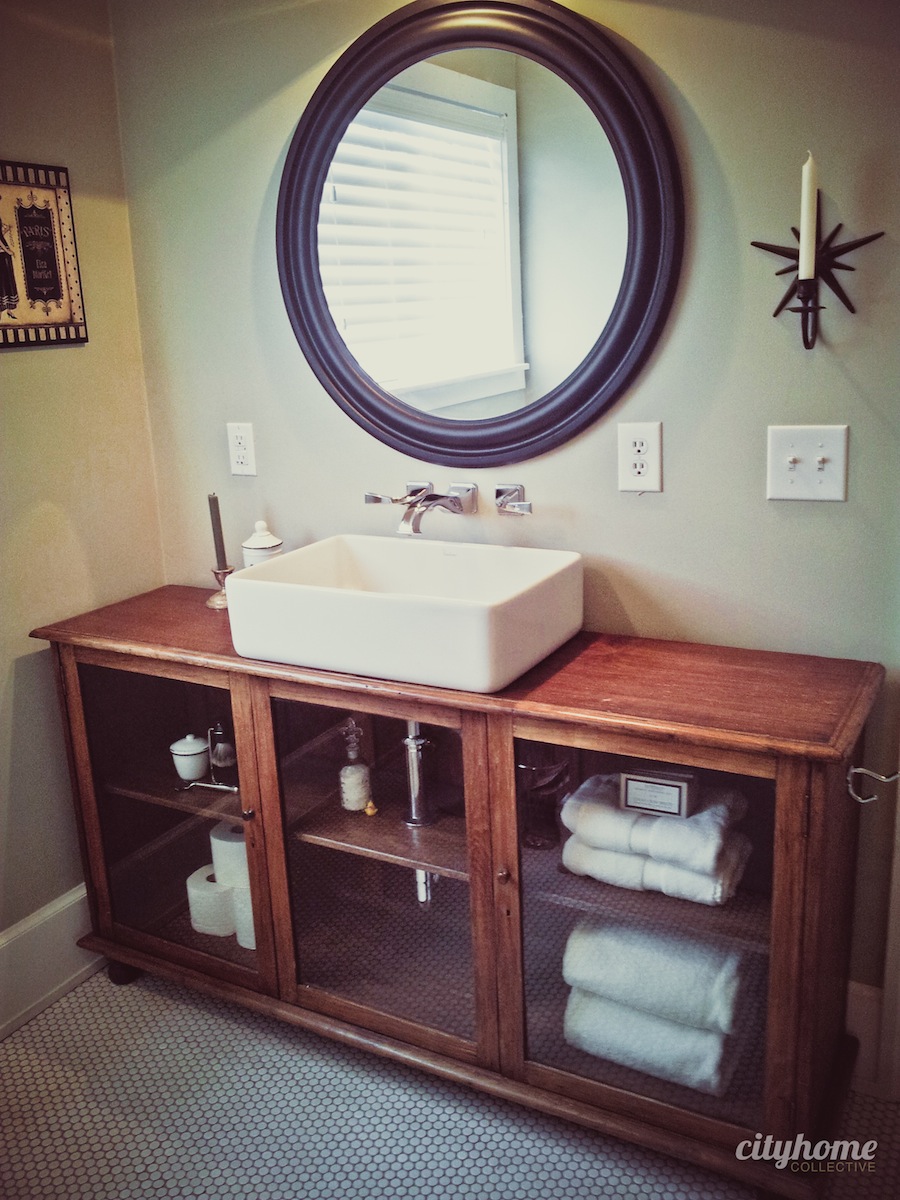 In my renovations, 'standard' does not always work for me. I find this to be true in bathrooms, in particular. For any who have renovated a home built at the turn of the century, you may have found yourself sneaking inches here and there, trying desperately to fit current standards into a space that was designed for folks that were either tiny, or far less focused on grooming efforts. For that reason, and a boatload of others, it's best to think a bit differently when it comes to vanities. Below is the route we took in my own [recently and beautifully] renovated home; it's one option that will enable you fit a vanity into a less-than-standard counter depth, as well as bring a unique, eclectic style to your bathroom.