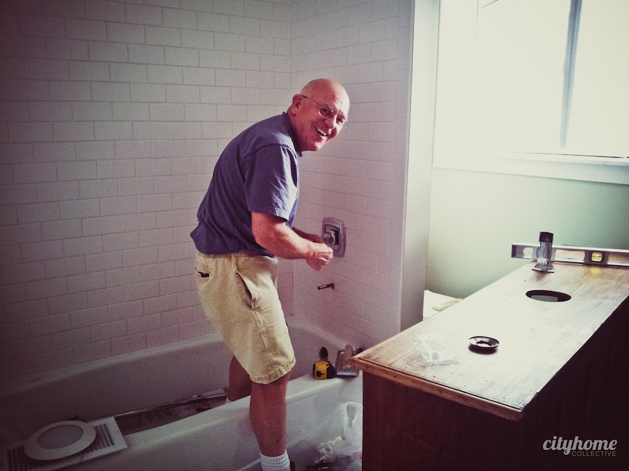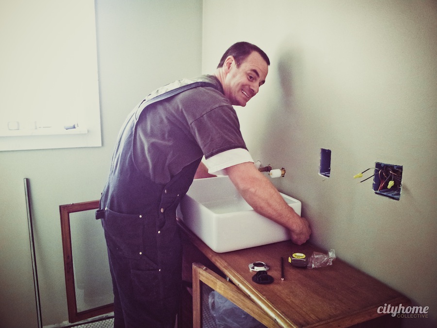 3rd Step: Mike is my favorite plumber, so I enlisted his help. He and his dad [I get the pair of them when I am lucky] humored me throughout the process with design thoughts and opinions on all matters plumbing-related or not. Once I explained the goal, Mike made it work, drilling holes and sourcing the perfect chrome p-trap and other plumbing accoutrements. With the full-glass front, having pretty hardware was critical.
