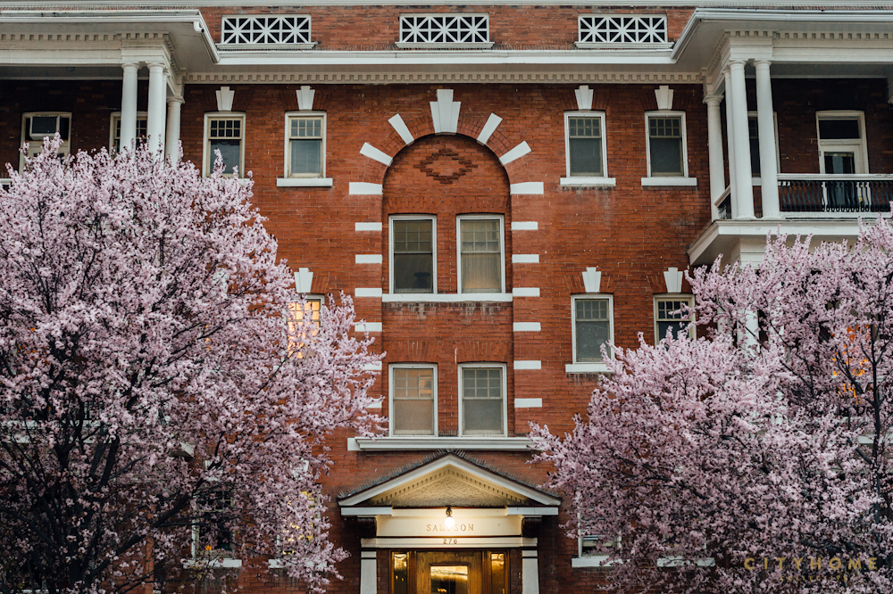Built in 1906 by August Rudine, the Sampson Altadena buildings are on the National Register of Historic Places. The 3 1/2-story building is stone and brick, and gives a solid nod to Neoclassical architecture with features like Baroque-style balconies, Tuscan columns, accentuated keystones, and a dentilated pediment above the entry. Individual units boast high ceilings, and an air of timelessness can be seen in the woodwork, moldings, exposed brick, and leaded-glass windows. Bonuses include building security, pet-friendly policies, and available garden plots for residents.