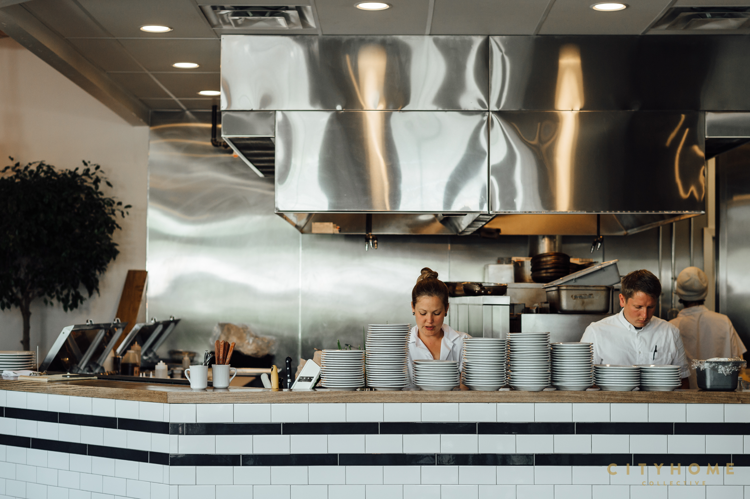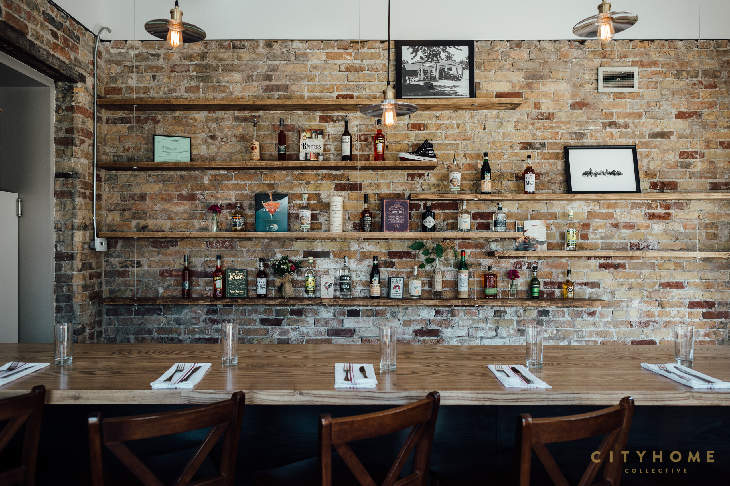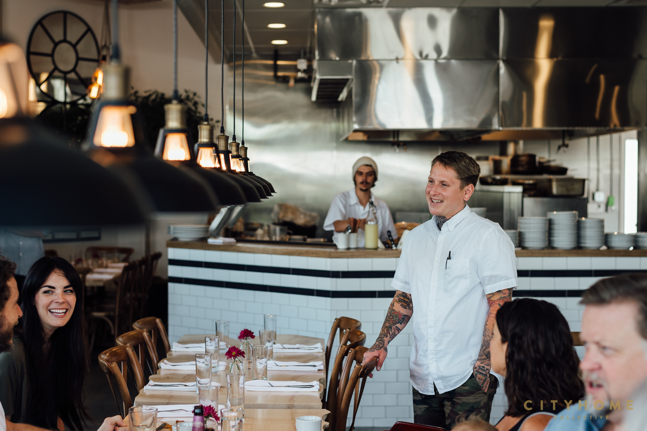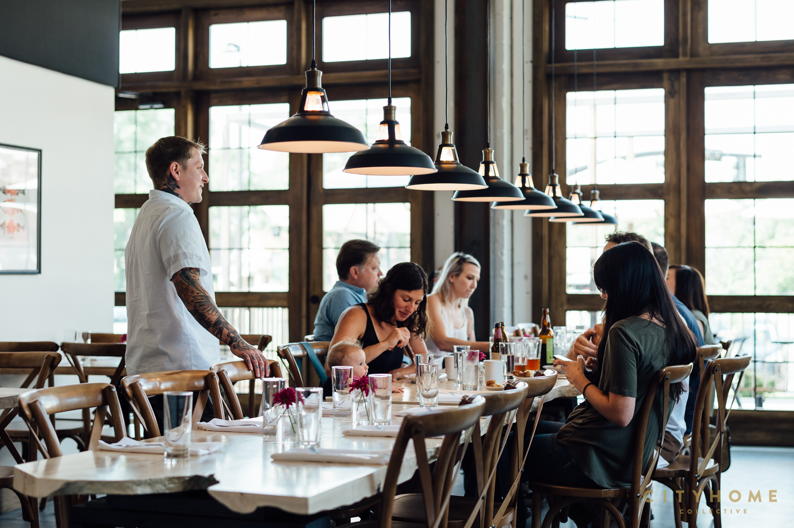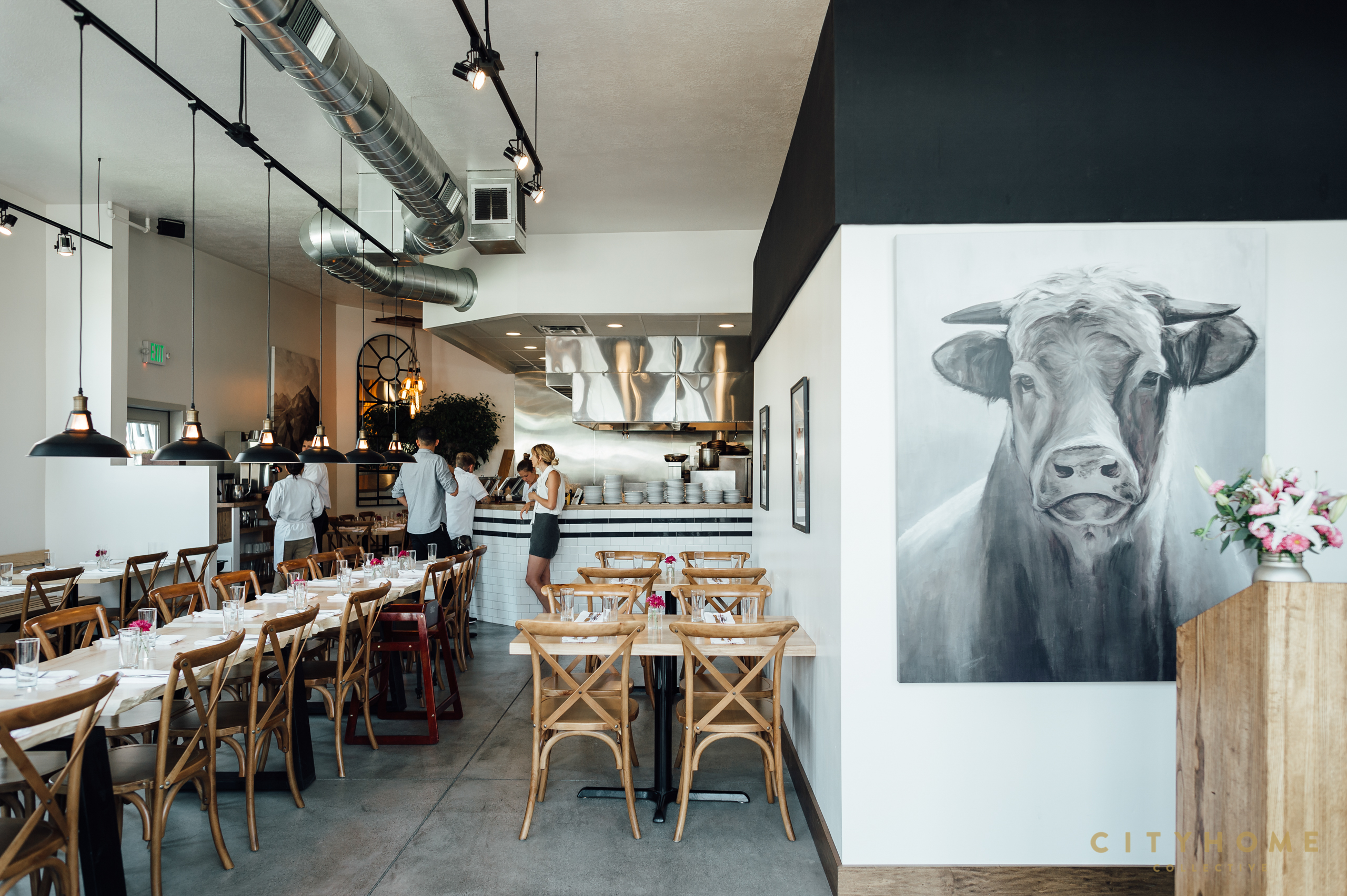 The eatery officially opened its doors in April of this year, when owners Ashton Aragon (who runs the business end of things) and Max Shrives (the head chef) hit the ground running and never looked back. The idea was simple: fresh ingredients and from-scratch cooking with elevated flavors and plating. The interior reflects those principles perfectly. The space, which was cooked up by Max and Ashton, along with help from MJSA Architects' Ralph Nagasawa, is clean, open, and full of light. A few darker, more-masculine elements lend a dose of the rustic, and along the room's center runs the communal dining table: two massive slabs of Boxelder maple sourced from Liberty Park.