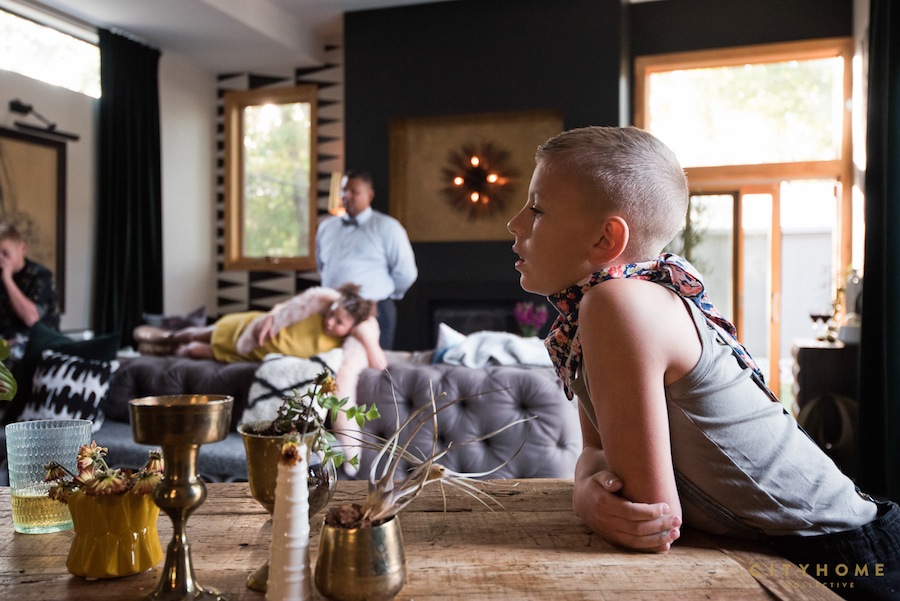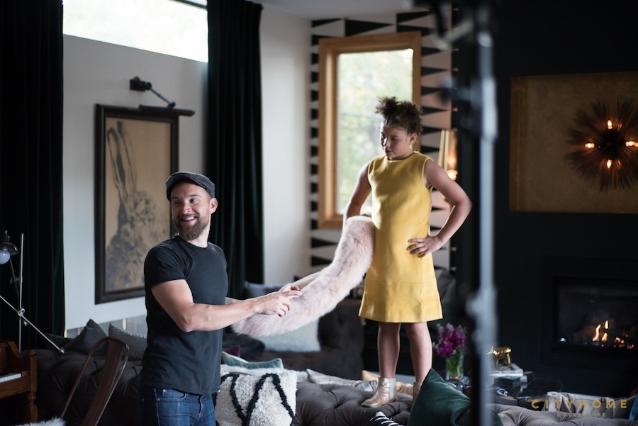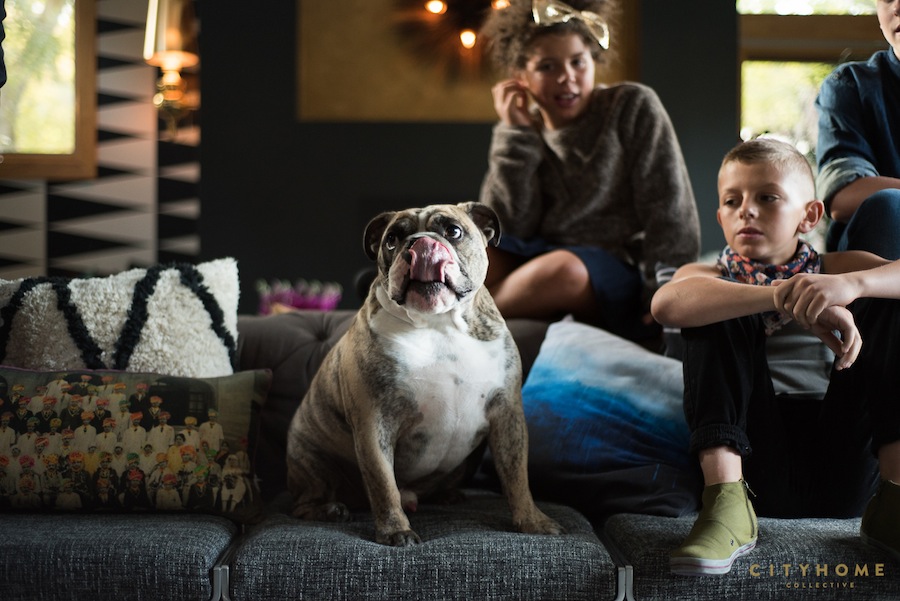 We had a little something to do with the snazzed-up interior of this space (and, since Cody helped them snap up the 9th & 9th home in 2009, you could say we had a little something to do with the exterior, as well). Last year, the family elected the help of our own Andrea Beecher to help with the re-design of an amazing patio (story coming soon!) and the main living space. The personality of the design matches that of this vibrant fam--it's a direct reflection of the varied personalities and super fun vibe of this tribe. The color palette is killing it (moody greys and gold--c'monnn...), and there are tons of quirky, colorful details thrown in for good measure: that statement Bill Murray pillow (we die), some well-chosen wallpaper on the south and east walls, a neon sign, and a massive, comfy, bad-ass couch (fully conducive to family gathering). All bases are covered for fashionably-functional family living. It's the perfect fit.