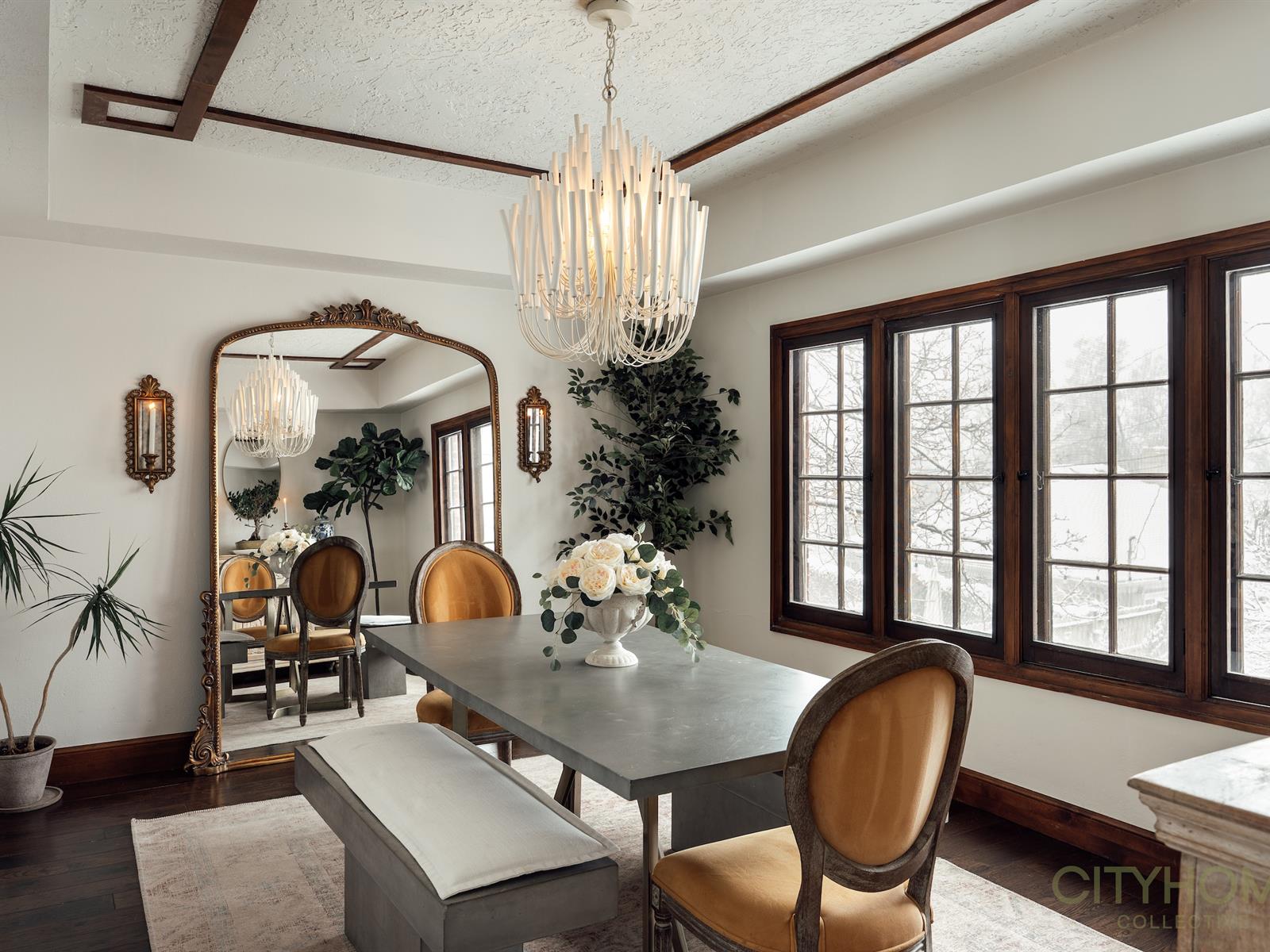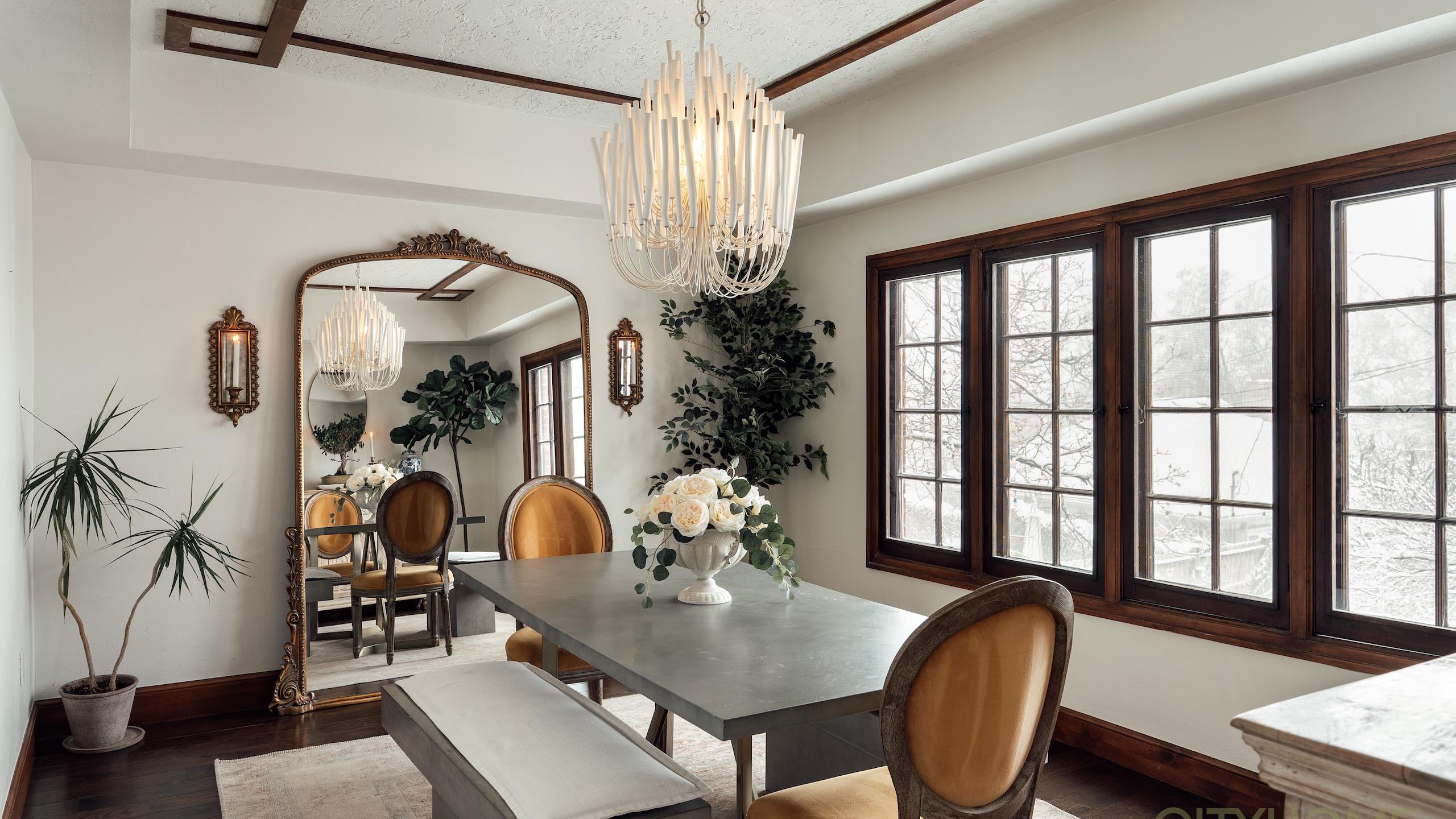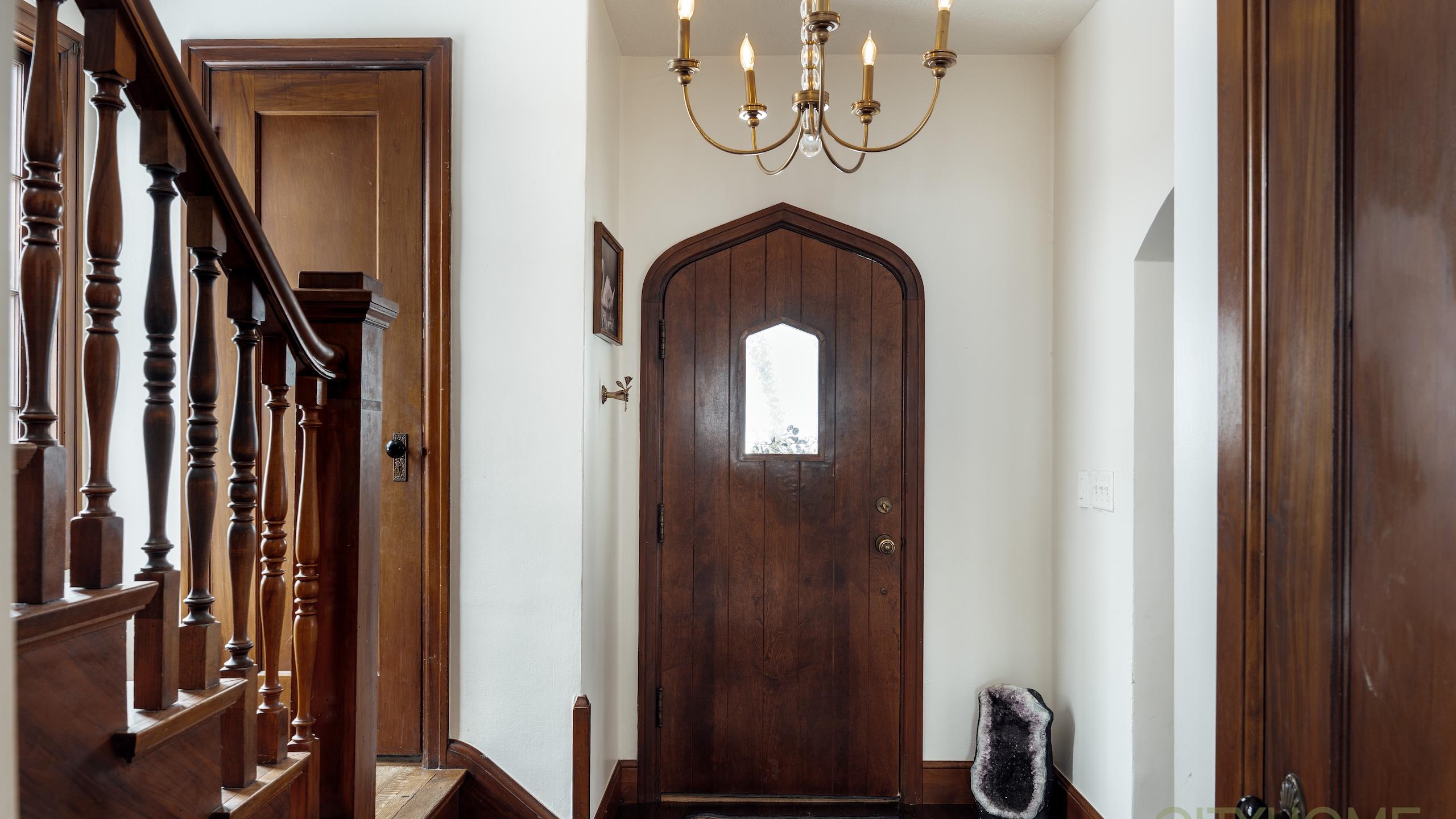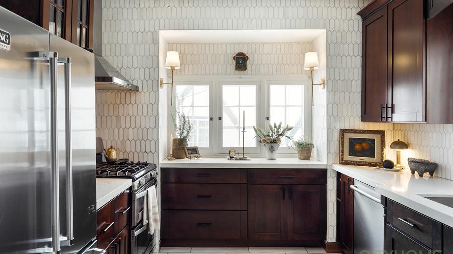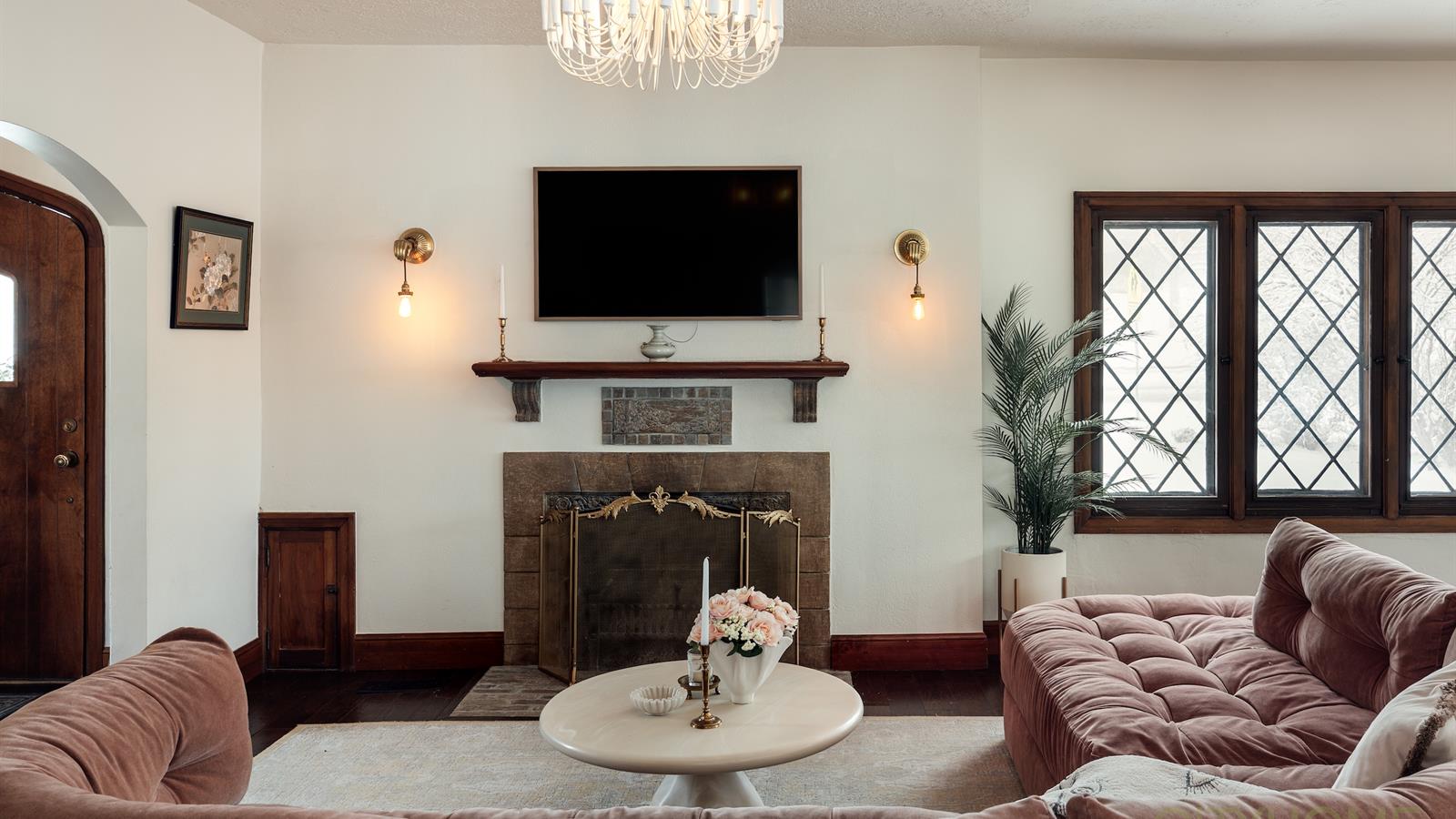 Rich original woodwork, graceful architectural lines, and an original fireplace adorned with handmade tile details create that unmistakable old-world warmth, while curated lighting and elevated finishes bring a fresh, contemporary glow.