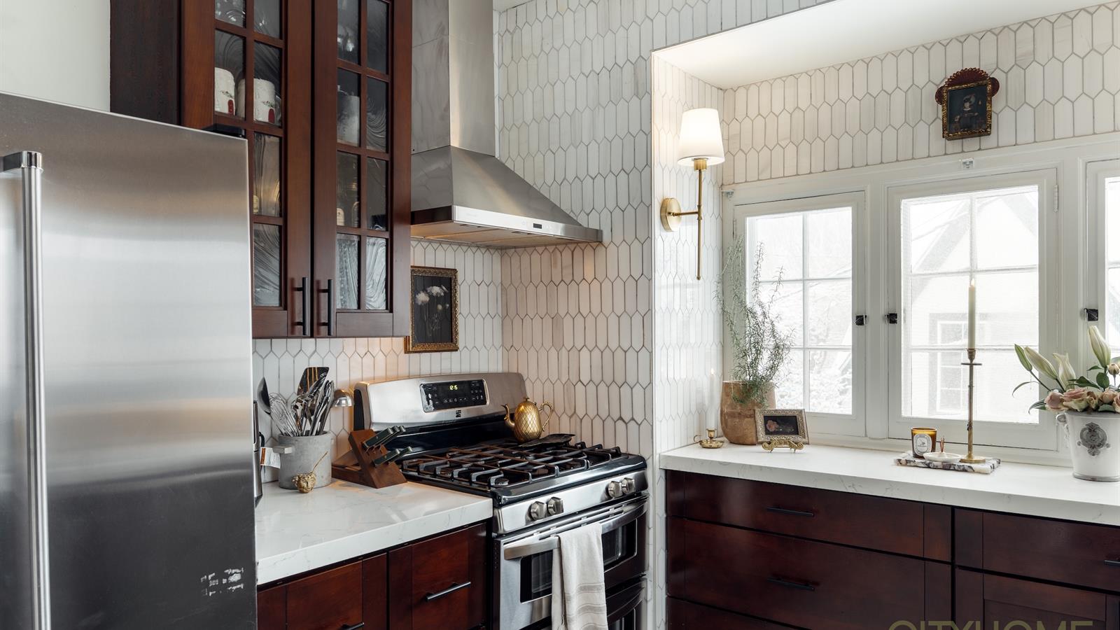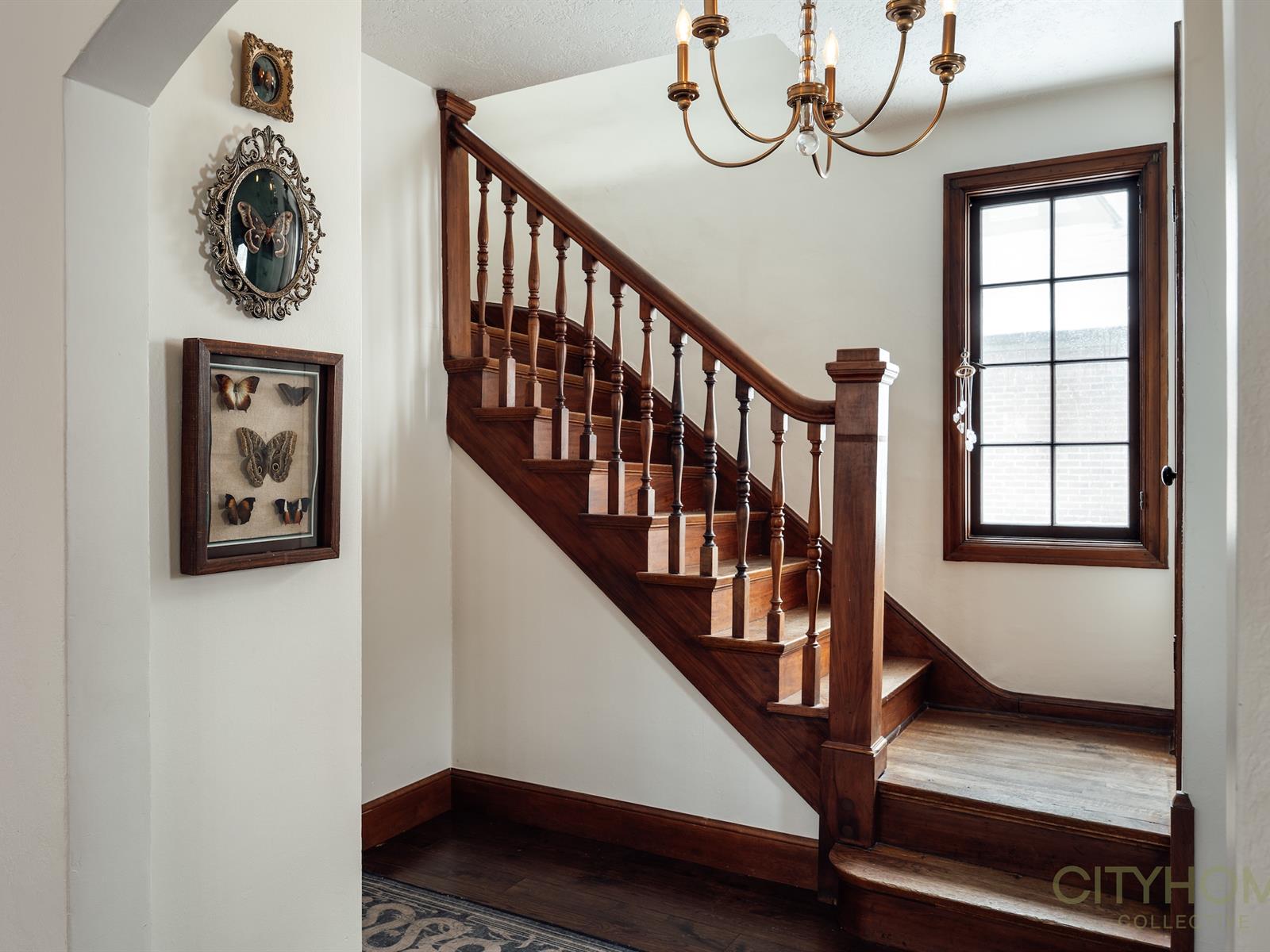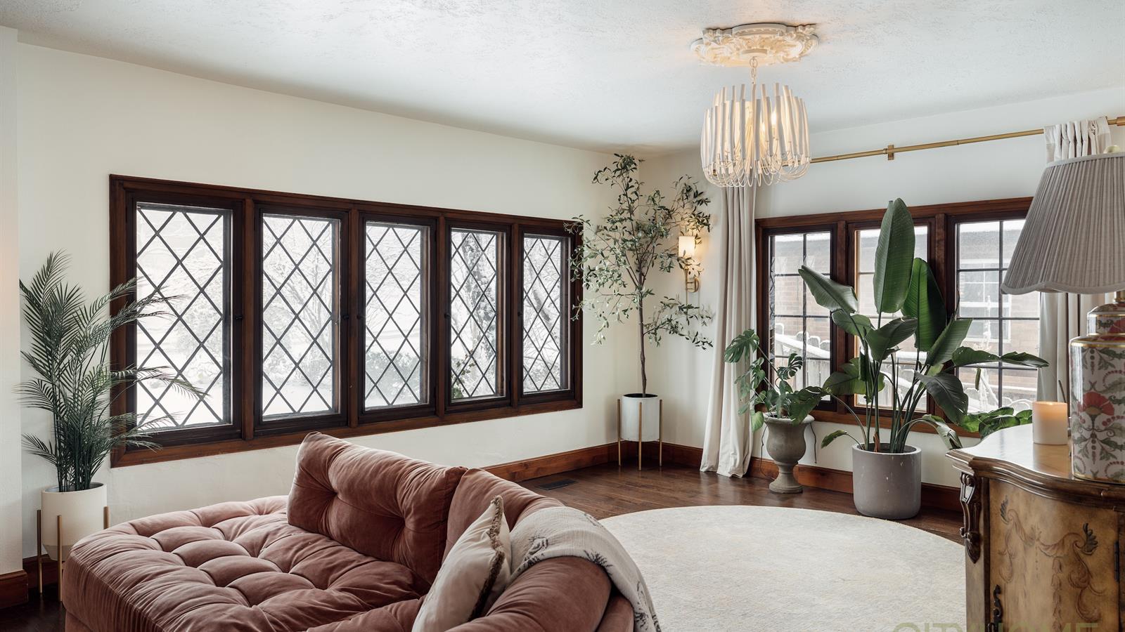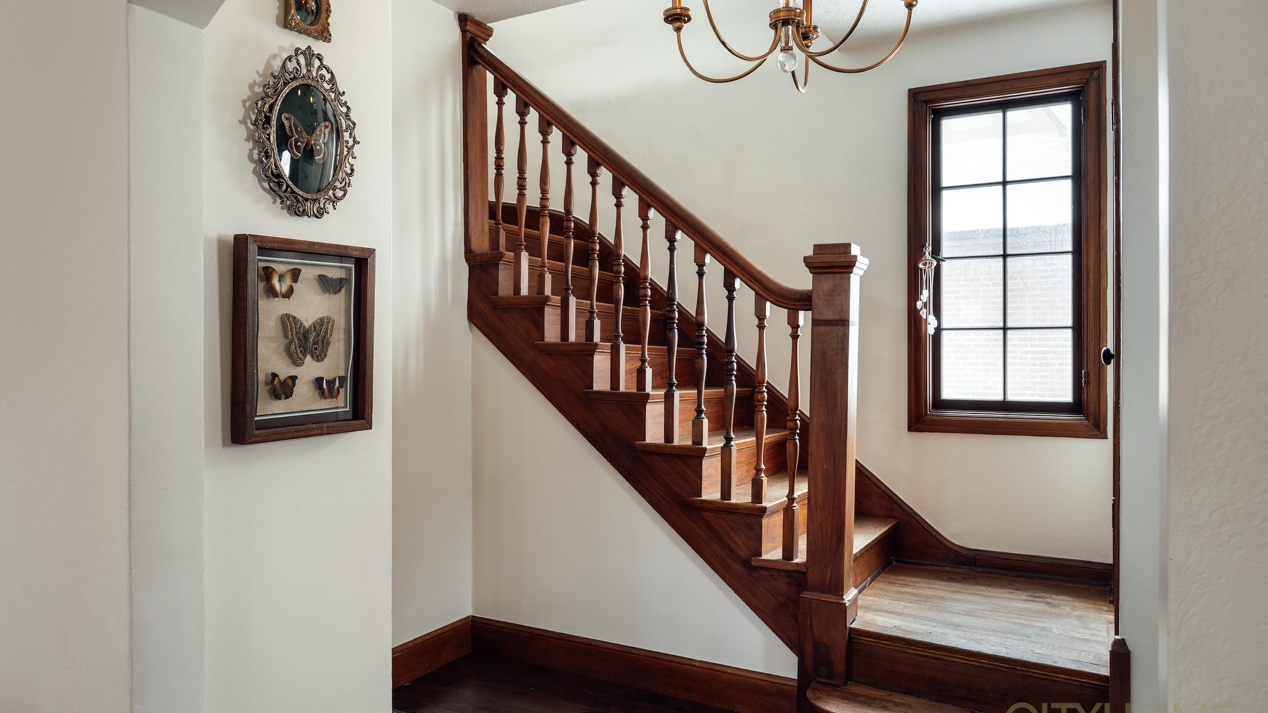 Rich original woodwork, graceful architectural lines, and an original fireplace adorned with handmade tile details create that unmistakable old-world warmth, while curated lighting and elevated finishes bring a fresh, contemporary glow.