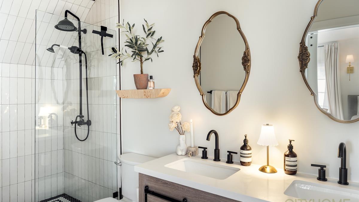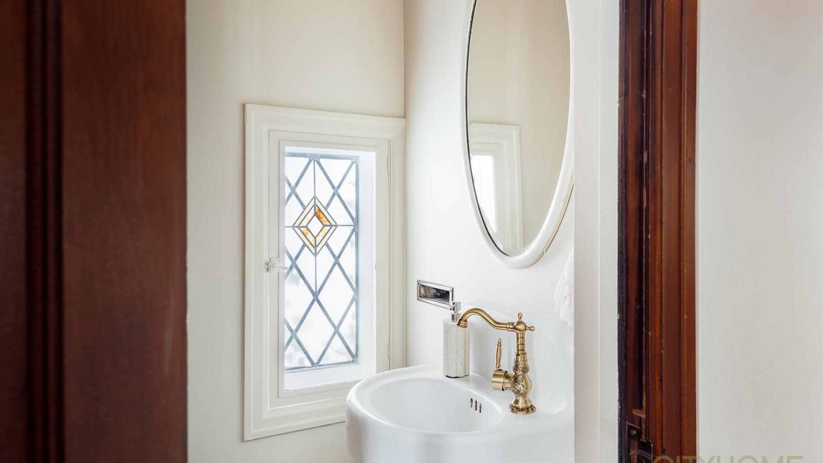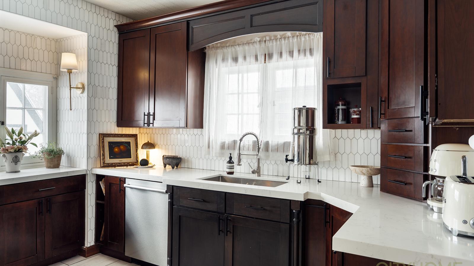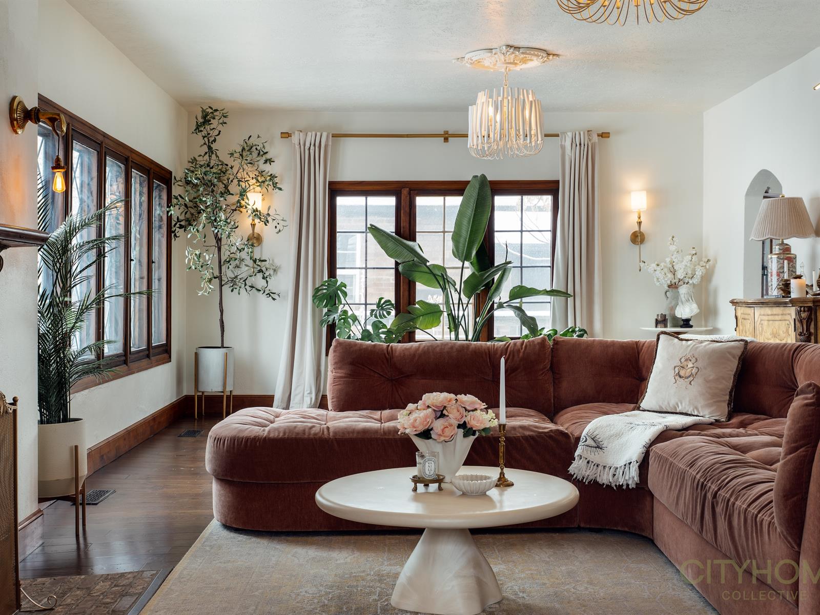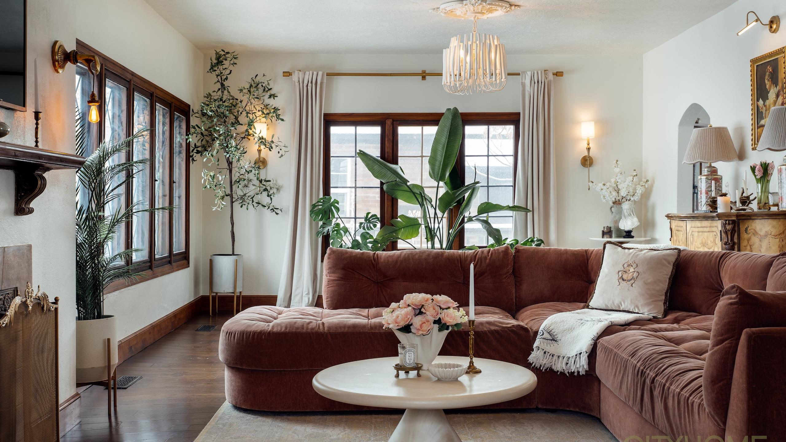 Rich original woodwork, graceful architectural lines, and an original fireplace adorned with handmade tile details create that unmistakable old-world warmth, while curated lighting and elevated finishes bring a fresh, contemporary glow.