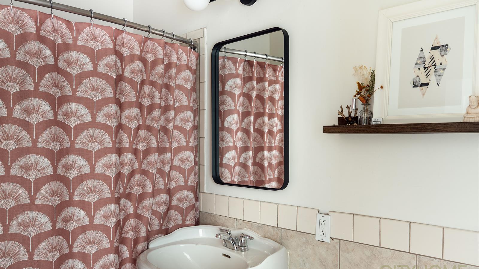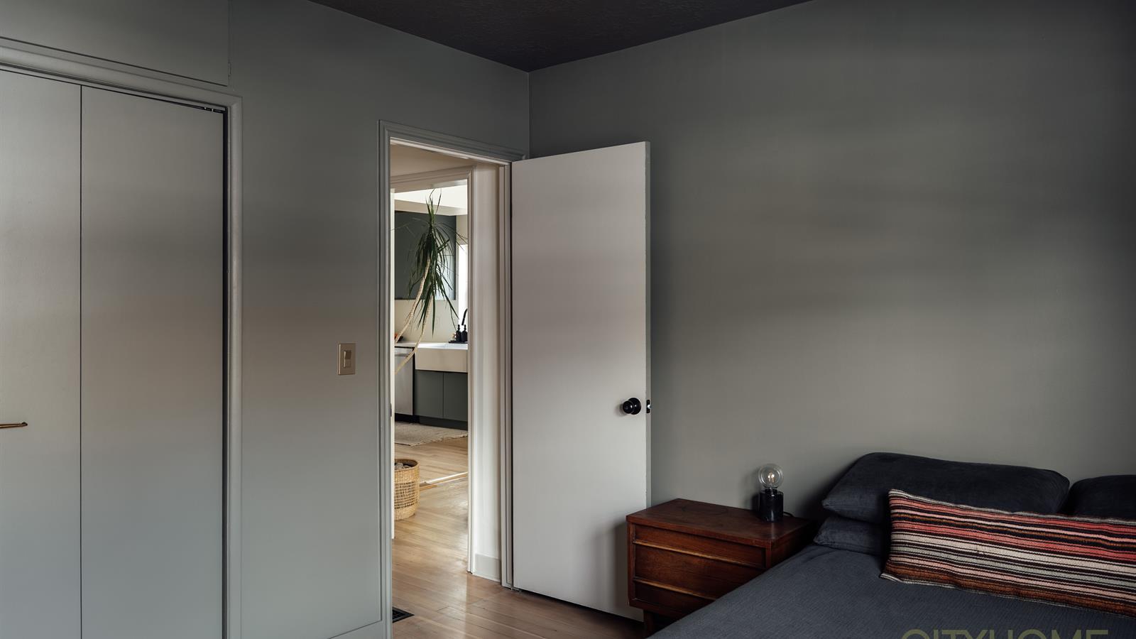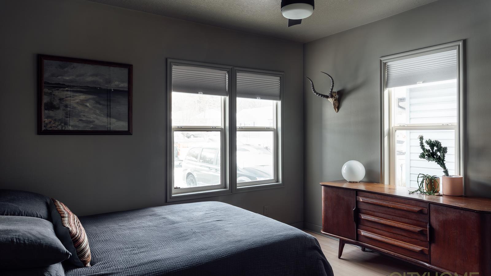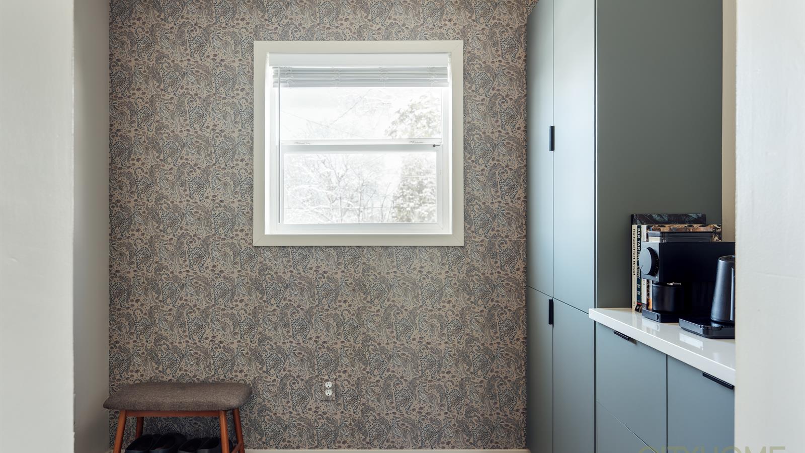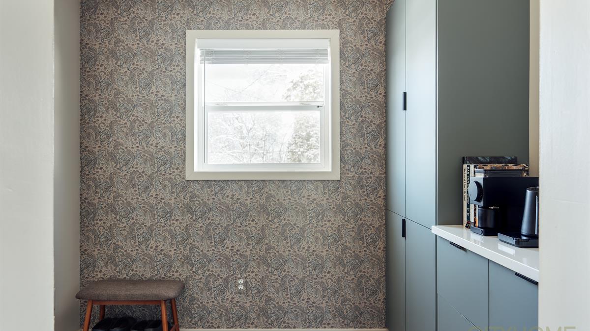 The rear entry offers a refined yet playful aesthetic with patterned wallpaper and new tile, elevating this practical space into a visually interesting anchor point for the home. This main level has two bedrooms and a full bathroom, completing its functional flow.