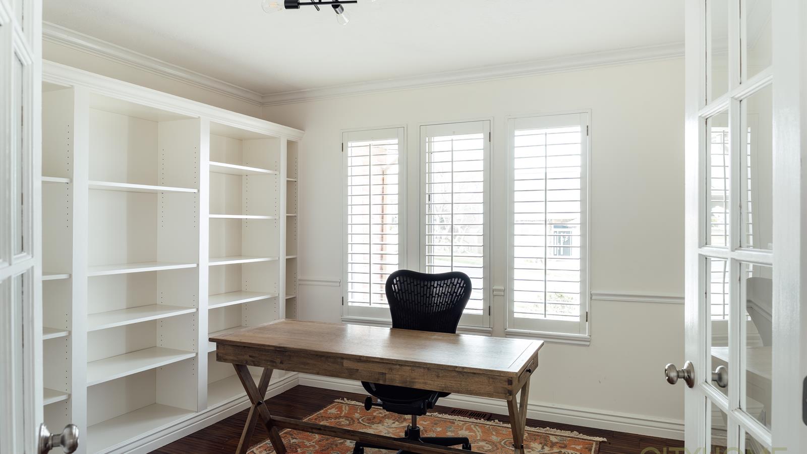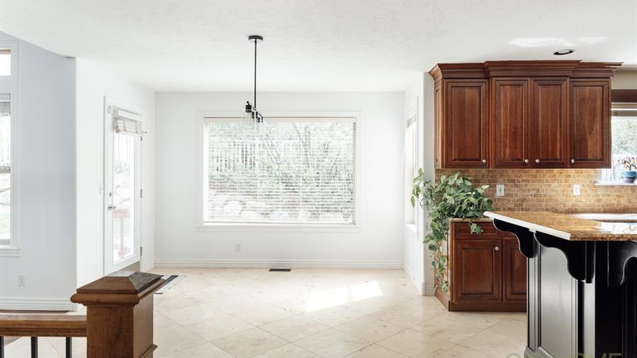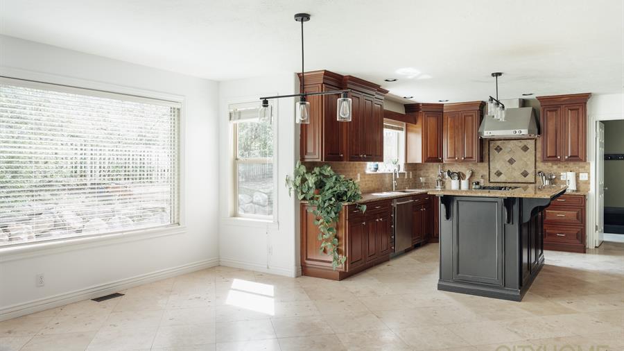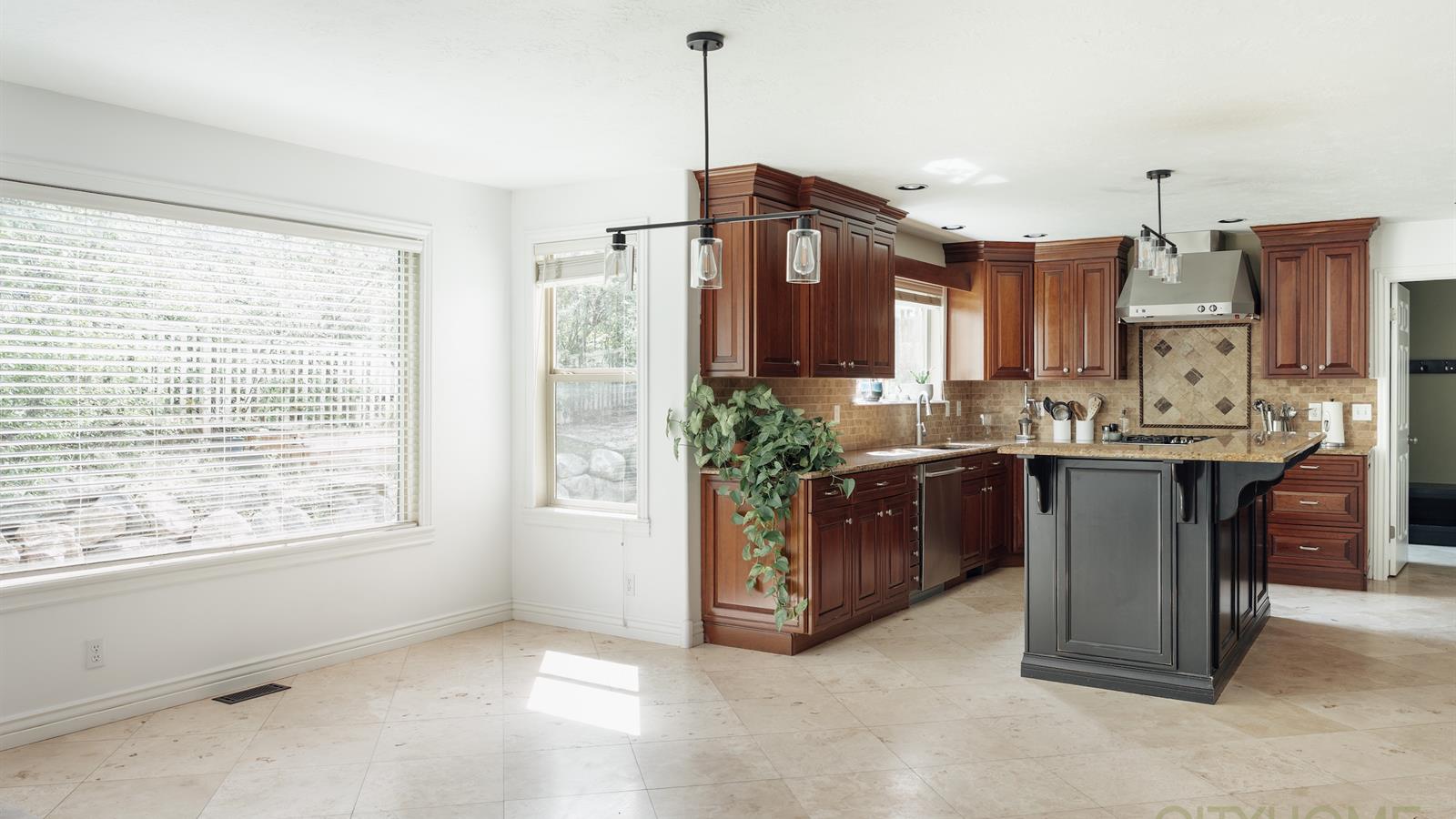 The thoughtfully designed layout is open for easy flow and connection (think fun family birthdays or lively friend gatherings), yet offers many distinct spaces to find a quiet haven. The large kitchen, outfitted with granite countertops and new appliances, connects seamlessly to an inviting dining and living space, where high ceilings and large windows allow for abundant natural light.