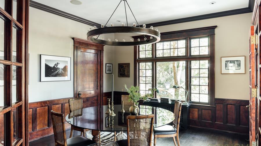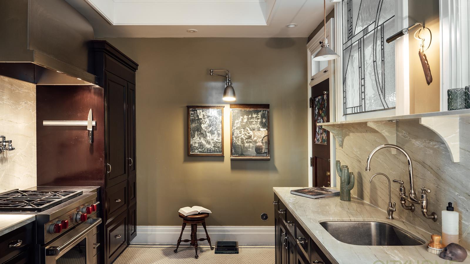 The kitchen carries its own historic story, with original mosaic tile floors thoughtfully preserved alongside gorgeous limestone countertops and chef-grade appliances, including a Wolf range, Sub-Zero refrigerator, and industrial hood. Spacious counters and a generous dining room make cooking and entertaining as easy as it is elegant.