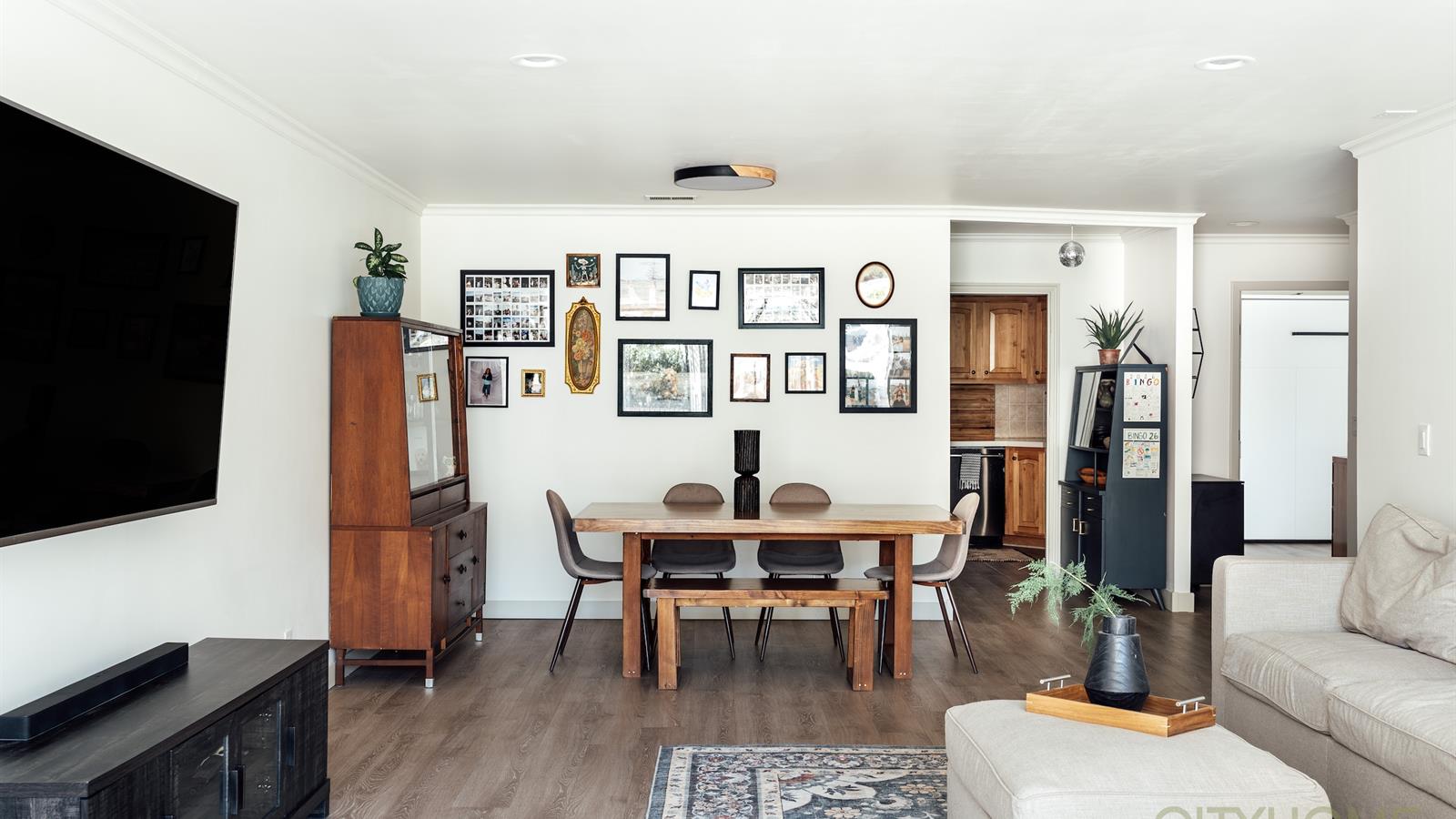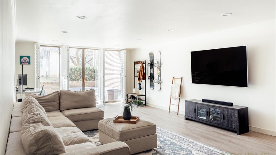 The living room—at the heart of this single-level condo—seamlessly connects the dining area and outdoor patio. Recently installed plank flooring replaces the carpet, while the kitchen and bathrooms have been thoughtfully updated to feel bright and fresh. The home also features an in-unit washer and dryer, generous storage, and convenient elevator access to the underground garage.